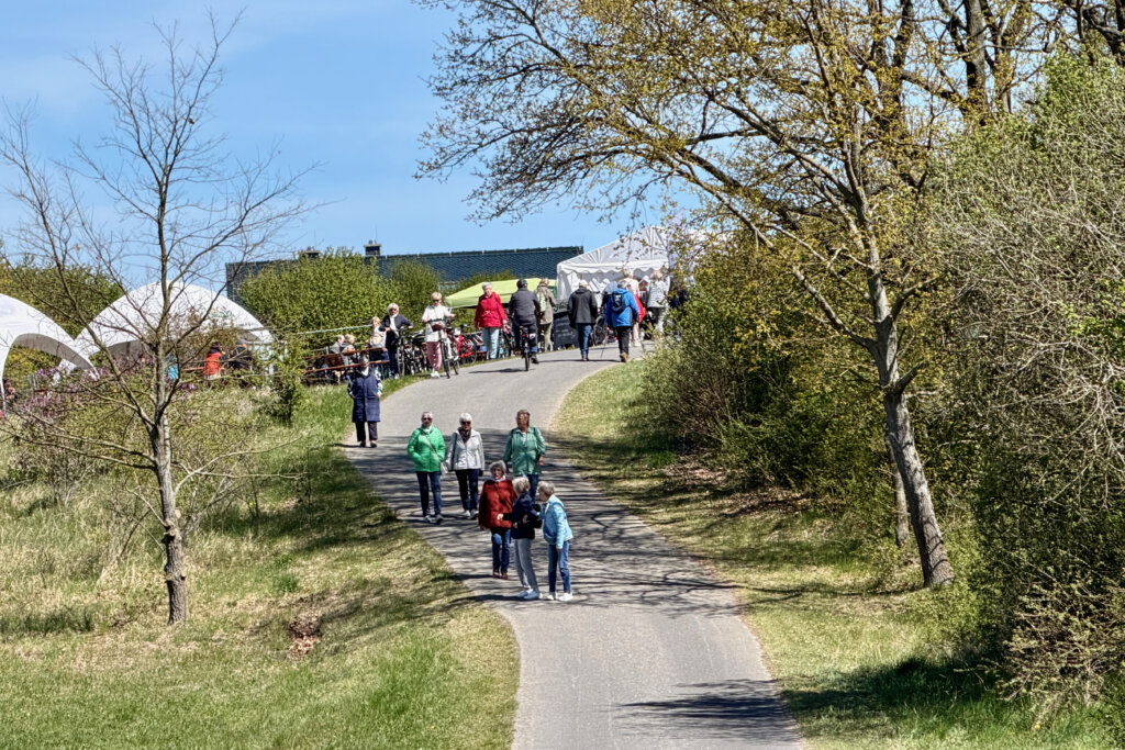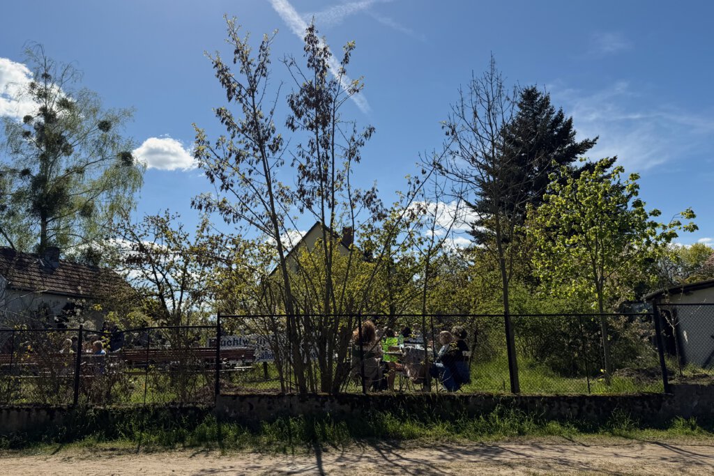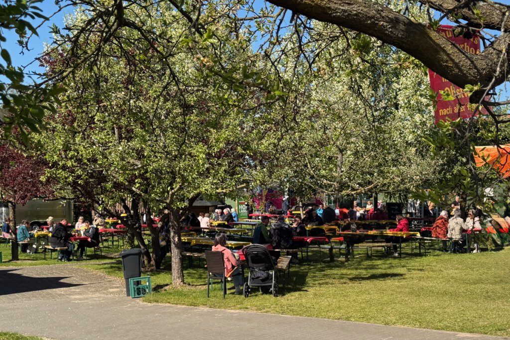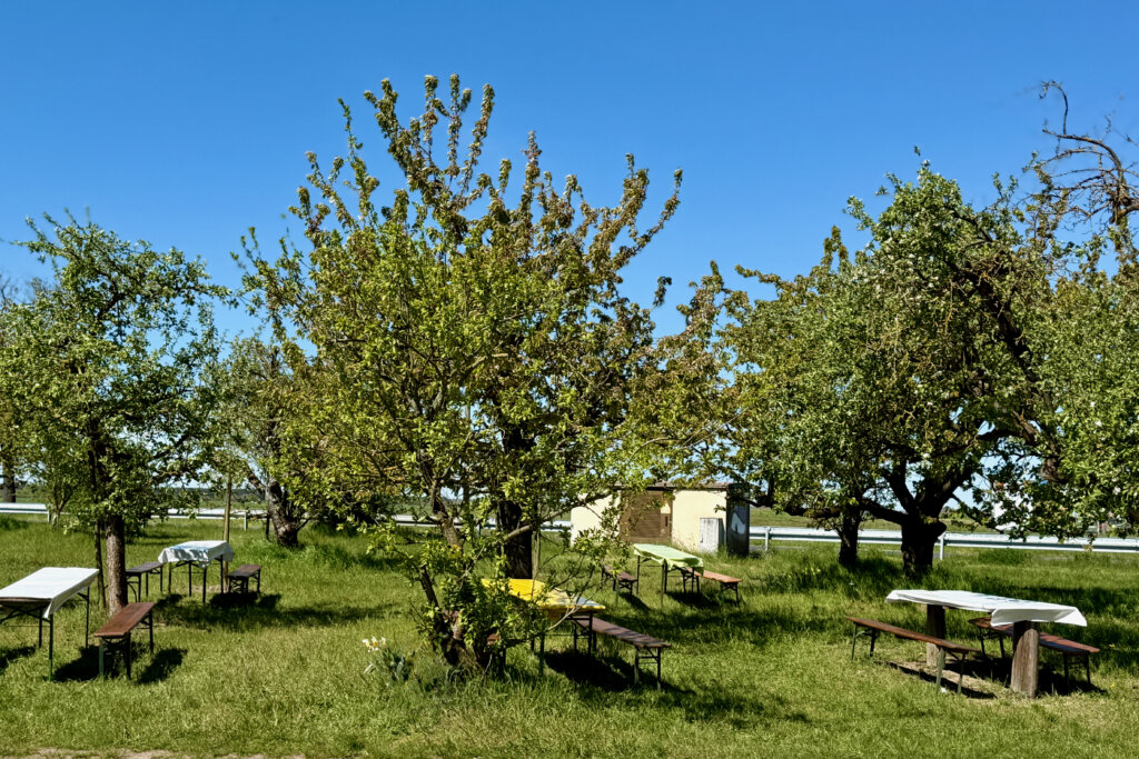 Die Bänke stehen unter den Bäumen, die ihre Blüte leider schon abgeworfen hatten. Doch das wird vom Klimawandel beeinflusst und nicht von den Obstbauern. Anregungen, das Fest um 14 Tage vorzuverlegen, scheiterten daran, dass der 1. Mai traditioneller Bestandteil der Baumblüte ist.