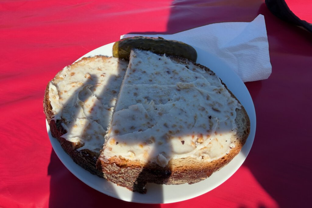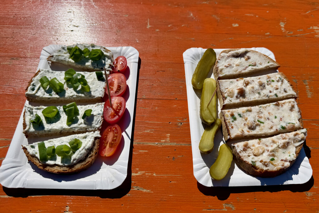 HeiDie’s Alm befindet sich auf dem Karfunkelberg. Der Bus hält nur wenige Schritte entfernt. Hier bekamen wir das traditionelle Schmalzbrot mit saurer Gurke und eine Alternative mit Tomate, Lauch und Frischkäse. Ein Brot kostete 3,50 EUR. Weil ich auf die Röstzwiebeln auf der Schmalzstulle verzichtete, bekam ich 50 Cent Rabatt.
