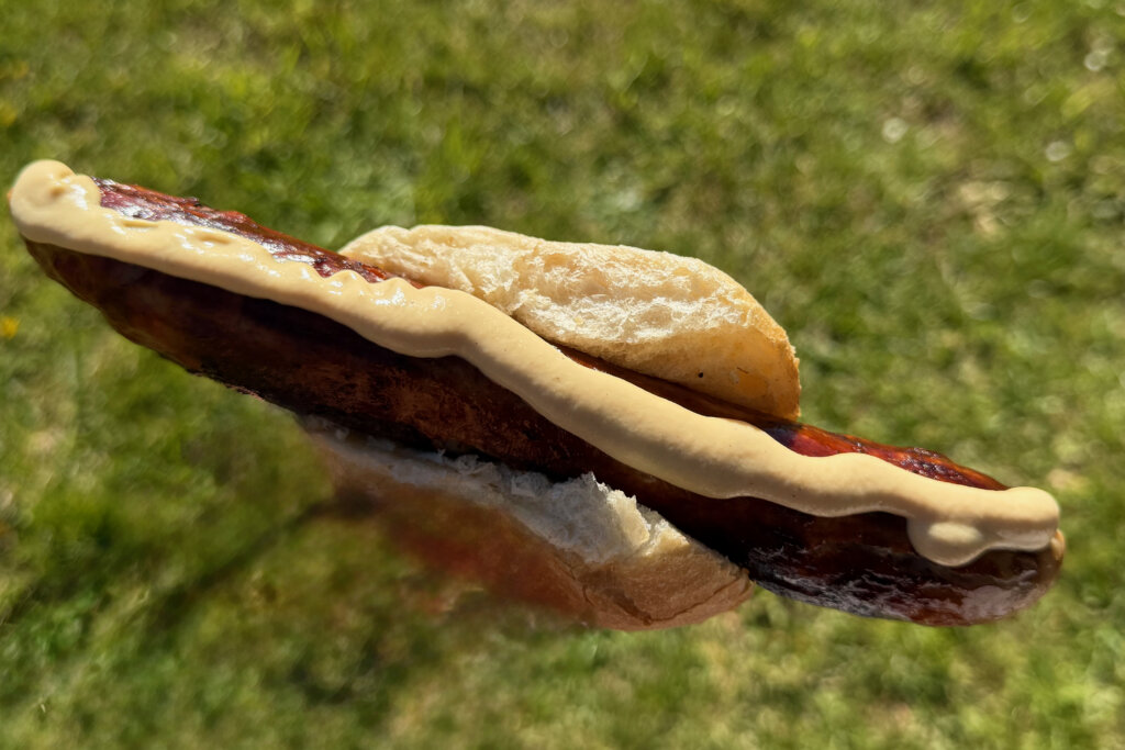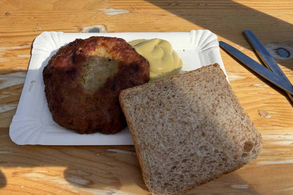 Ein paar hundert Meter weiter entschieden wir uns bei Seiffert für die Thüringer Rostbratwurst, die ebenfalls 5 EUR kostete. Seiffert’s Streuobst hat ein breites Angebot mit Suppe, Burgern und einem Kuchenbuffet. Du kannst sogar ein Stück Torte für 4 EUR genießen.