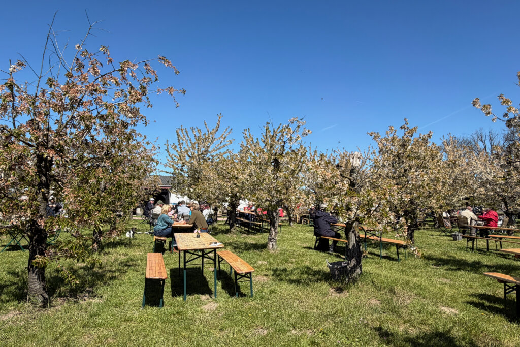 Das Ambiente unter den teils sehr alten Kirschbäumen ist wirklich schön. Der Hof ist beliebt, er war unter der Woche sehr gut besucht.