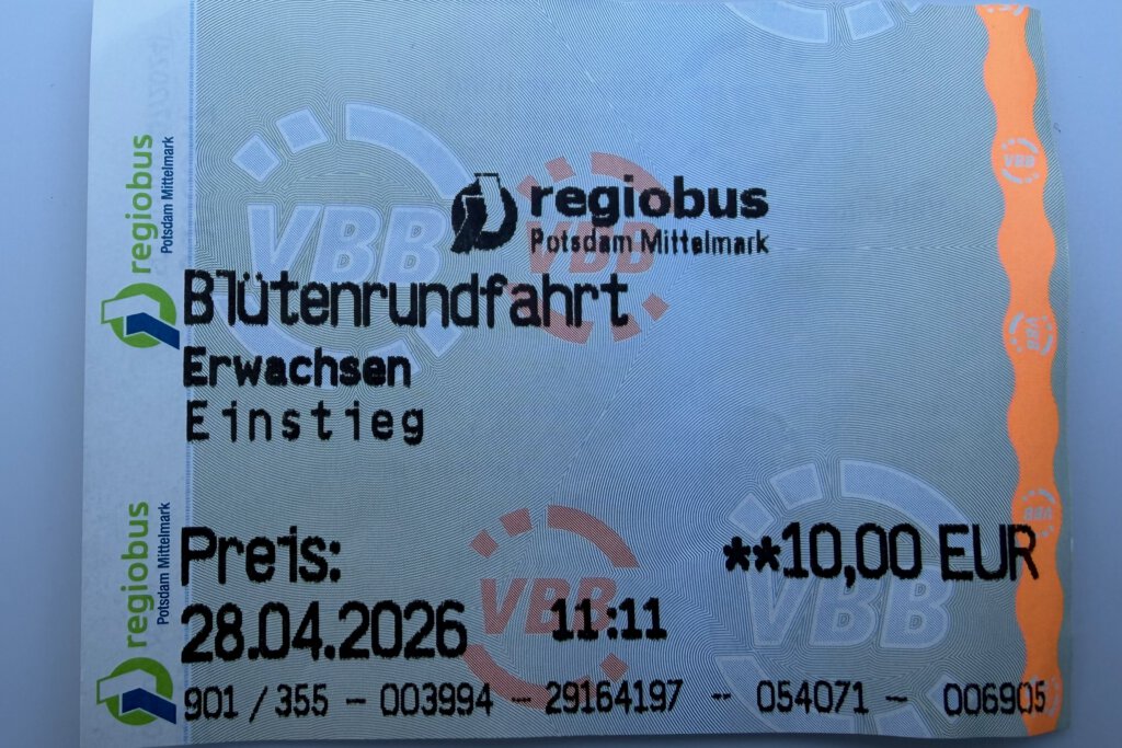 Der Blütenbus startet und endet am Bahnhof in Werder. Du zahlst einmalig 10 EUR und kannst auf deiner Tour so oft ein- und aussteigen, wie du möchtest. Die Fahrkarte gilt den ganzen Tag. Kinder fahren bis zum Alter von fünf Jahren kostenfrei mit. Zwischen sechs und 14 Jahren zahlen sie 5 EUR.