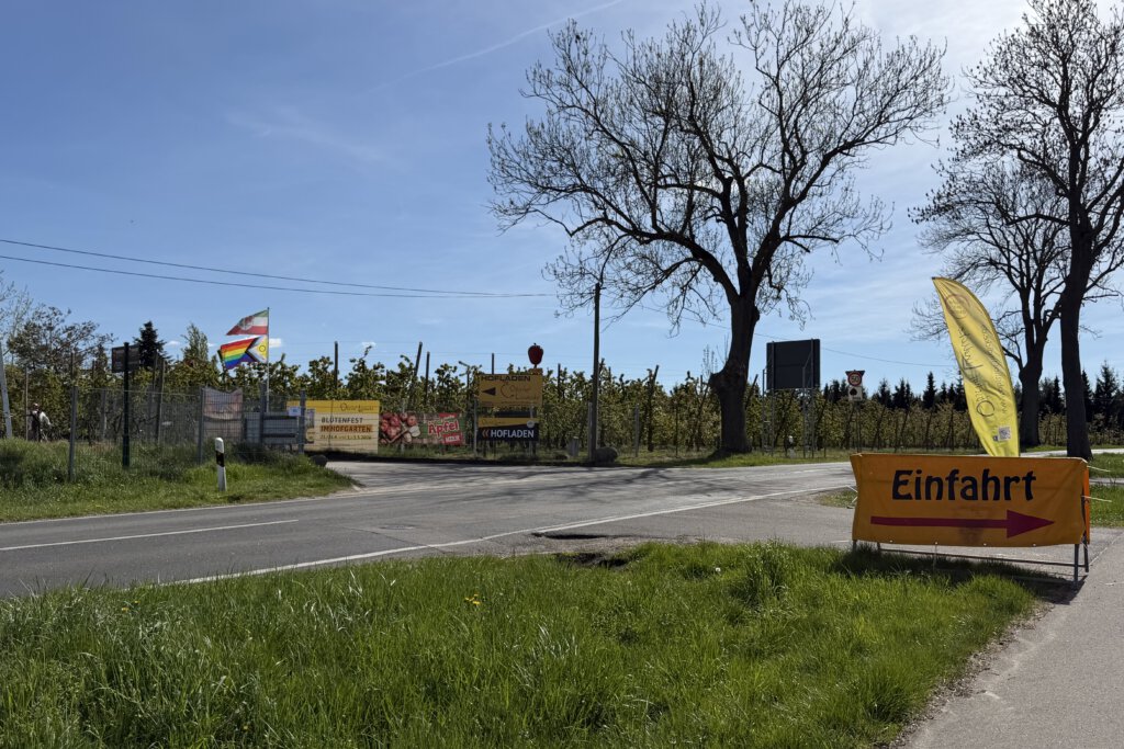 Der Obstpanoramaweg ist ein Fahrradweg, der für Pkw’s gesperrt ist. Bei unserer Tour hatte sich eine Autofahrerin mit heimischem Kennzeichen auf den Weg „verirrt“ und begegnete dem Bus in einer Kurve. Das war eine enge Angelegenheit: Du solltest besser nicht versuchen, den Blütenbus durch das Auto zu ersetzen. Polizei und Ordnungsamt sind dort während der Festwoche sehr präsent.