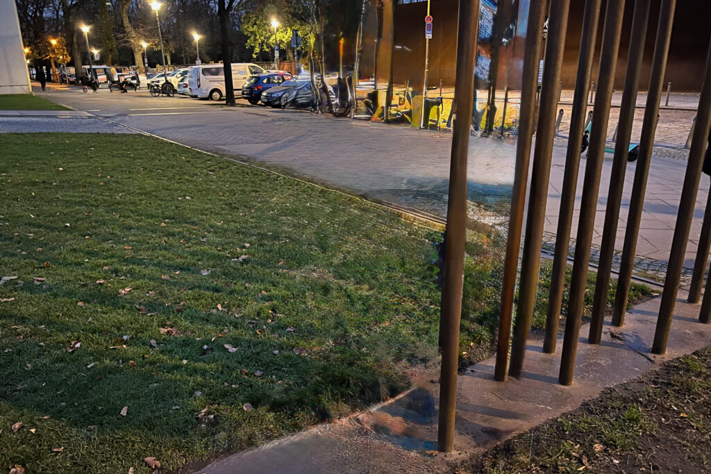 Der Verlauf der einstigen Mauer ist mit Eisenstangen aus Stahl nachgezeichnet. Du kannst dir Infokästen anschauen und Berichte von Zeitzeugen anhören. Eine von ihnen war die ostdeutsche SPD-Politikerin Regine Hildebrandt. Als junge Frau lebte sie in einem der Häuser, die später abgerissen wurden.