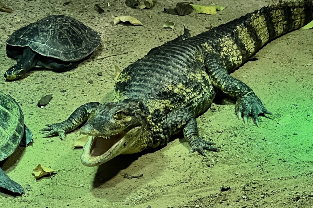 Dieser lustige Kaiman lebt gemeinsam mit mehreren Sumpfschildkröten im Krokodilhaus des Aquariums Berlin. Er verharrte über Minuten in der grinsenden Position. Was ganz normal ist: Die Tiere liegen über Stunden völlig unbeweglich an Land oder im Wasser. Nur so ist es ihnen möglich, blitzschnell zuzuschnappen, wenn sie eine Beute wittern. Wir zogen dann weiter und wissen nicht, wie lange der Kaiman in dieser Stellung verharrte. Sein Grinsen zeigte in jedem Fall, dass er sich wohl fühlte.