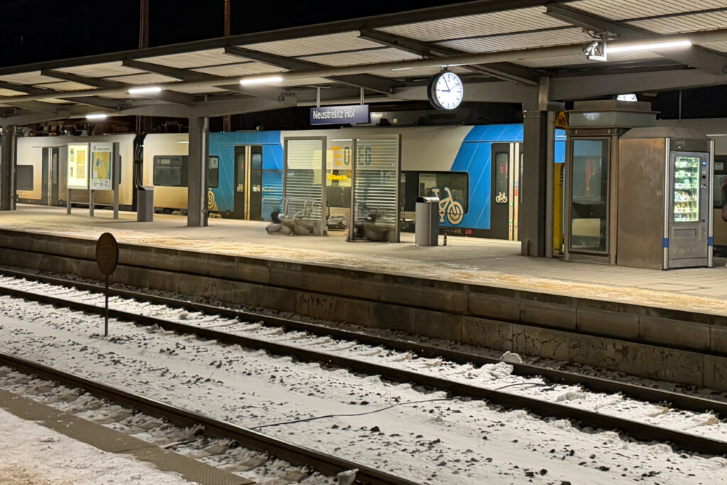 Der Regionalexpress RE5 fährt nach Stralsund. In den Sommermonaten gibt es eine Parallellinie mit Direktverbindungen nach Warnemünde. Diese konnten wir im Februar nicht nutzen. So fuhren wir bis Neustrelitz und stiegen dort aus. Die Fahrzeit von Berlin betrug etwa 75 Minuten. Der Zug war pünktlich.