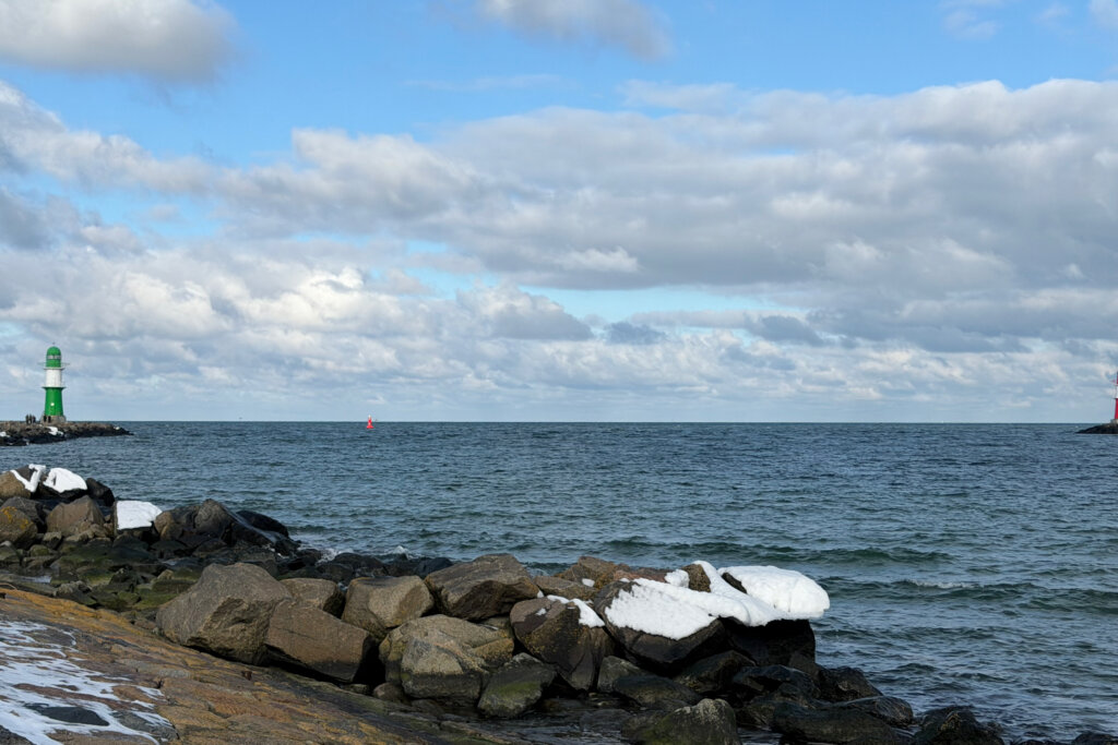In den Nachrichten hatten wir mehrfach Bilder von der zugefrorenen Ostsee gesehen. Dicke Eisschollen türmten sich am Strand auf. Die Natur war unbändig. Doch in Warnemünde wurden wir diesbezüglich enttäuscht. Die Wellen rollten an den Strand, als wäre es Hochsommer. Fast bekamen wir Lust, baden zu gehen Sie umspülten die Steine der Mole, die dann aber doch mit Schnee bedeckt waren. Wir recherchierten kurz auf dem Smartphone und fanden heraus, dass wir zum Darß oder nach Rügen fahren müssten, um eine zugefrorene Ostsee bewundern zu können.