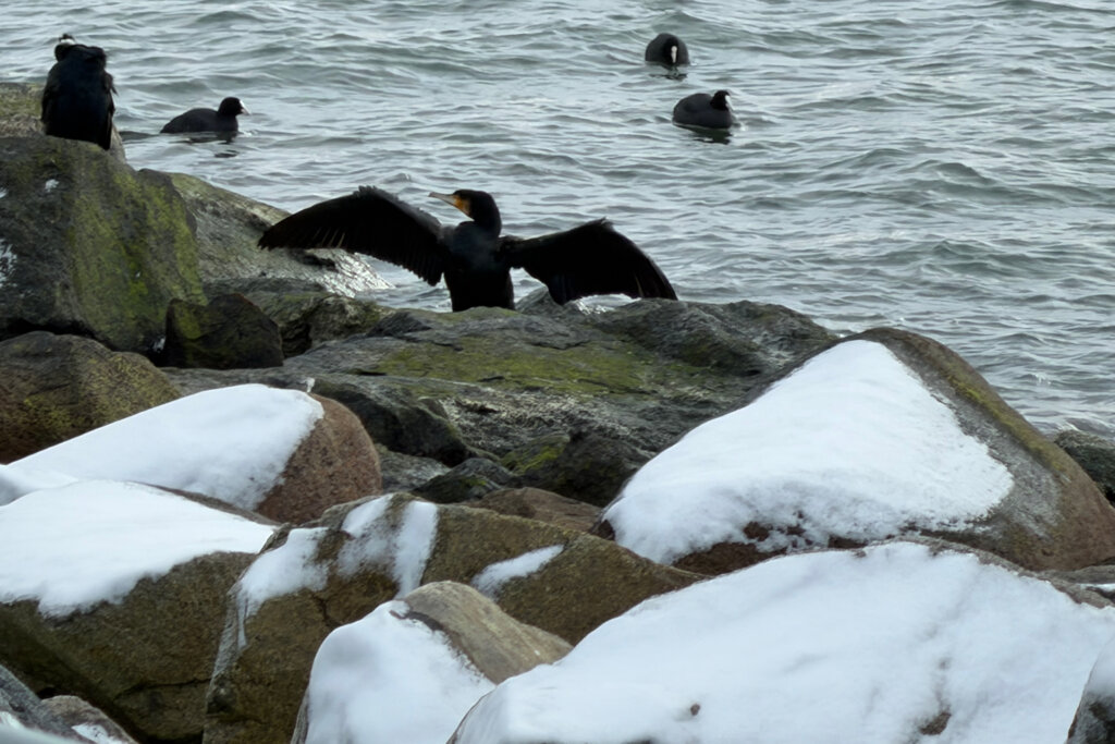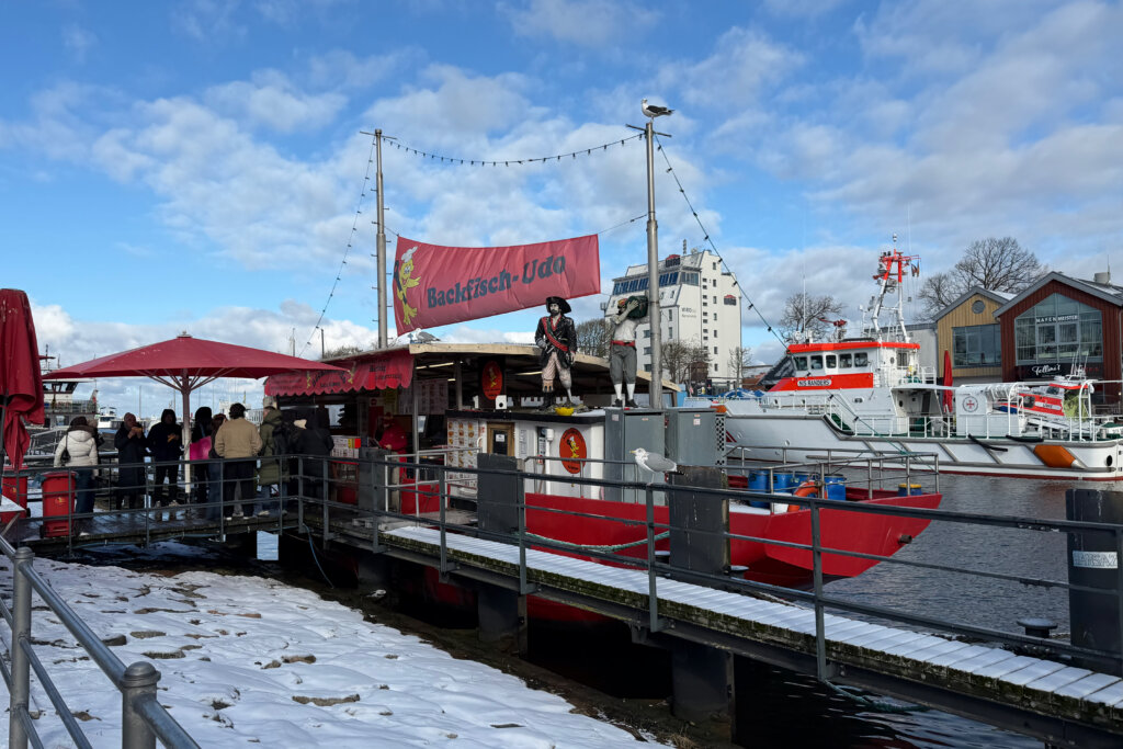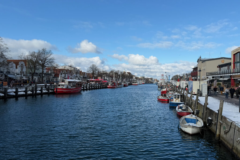 Dennoch pulsiert das Leben: Du kannst dich am Alten Strom für eine Hafenrundfahrt entscheiden. Die Fähren verkehren nach Dänemark und Schweden, wenn auch nicht so oft, wie im Sommer. Fischerboote und die Küstenwache verlassen den Hafen oder kehren zurück. Die Möwen kreischen, ein Kormoran trocknete sein Gefieder, die Enten und Lietzen – so nennen wir in Berlin die Blessralle – schwammen im eiskalten Wasser.