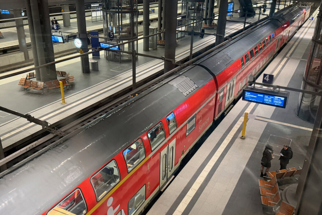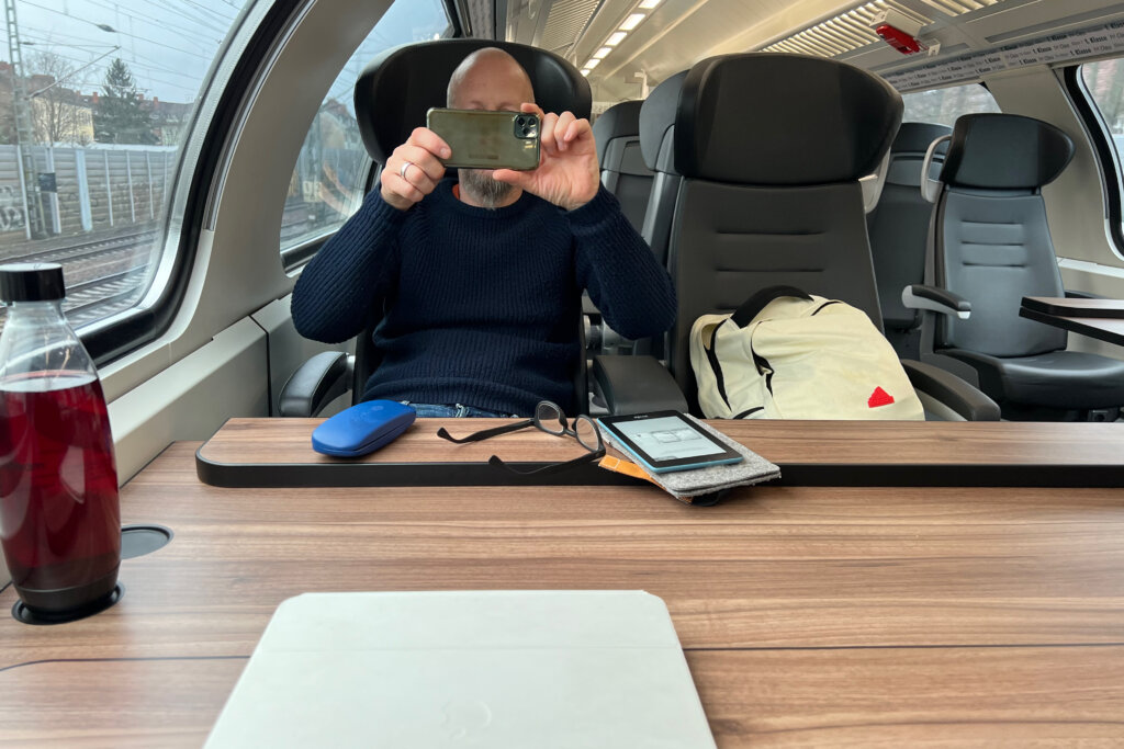 Wenn wir mit unserem Deutschlandticket längere Strecken im Regio zurücklegen, kaufen wir uns ein Übergangsticket für die Nutzung der Plätze in der 1. Klasse. Dort sind die Sitze etwas größer. Wenn du nicht einen sehr alten Zug erwischst, sitzt du an einem Tisch und hast Steckdosen zur Verfügung. Was uns darüber hinaus auffällt: Das Personal ist besonders freundlich.