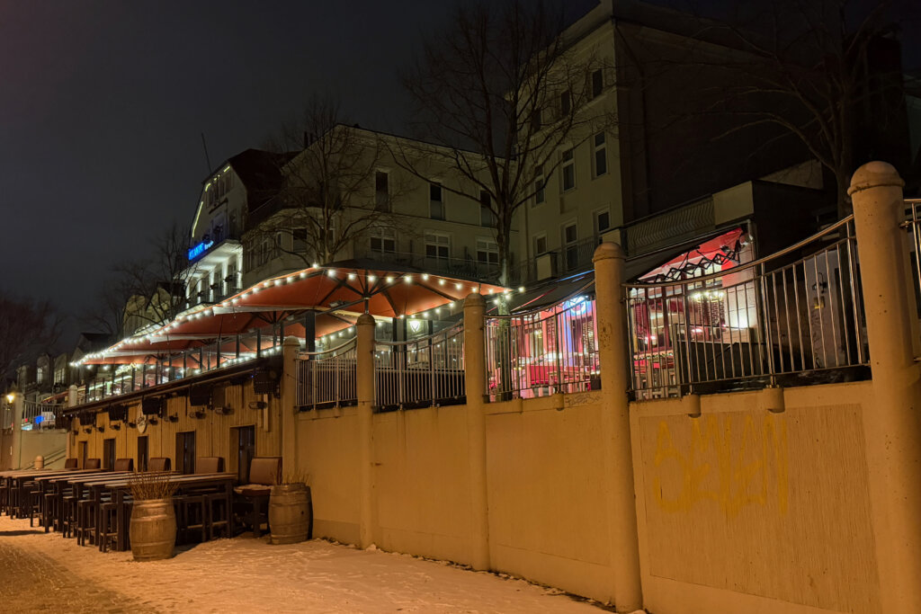 Wir schlüpften wieder durch die kleine Maueröffnung in der Wand der Mole und liefen über den Alten Strom zurück zum Bahnhof. Auch dort waren nur wenige Menschen unterwegs. Die Restaurants hatten noch geöffnet und boten Sitzplätze draußen an. Unter Wärmelampen und einer Decke lässt es sich vielleicht aushalten. Die Atmosphäre ist wirklich schön. Aber nach unserem langen Winterspaziergang hätten wir nicht draußen sitzen können. Uns wurde auf dem Rückweg schnell wieder kalt.
